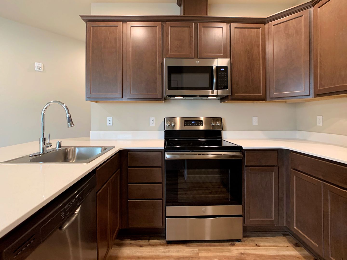 Discover the perfect blend of luxury and convenience in this stunning first-floor two-bedroom, two-bathroom apartment on Tumwater Hill. With breathtaking views and high-end finishes, this home offers an elevated living experience. The spacious layout features soaring 10-foot ceilings, floor-to-ceiling windows that flood the space with natural light, and a private balcony with an additional storage closet. The modern kitchen boasts quartz countertops, stainless steel appliances, and designer fixtures, while luxury vinyl plank flooring runs throughout the entire apartment. A stackable washer and dryer are included for ultimate convenience.